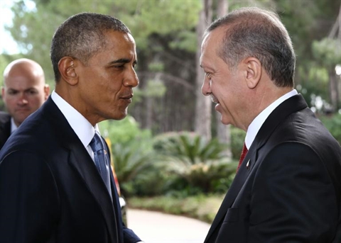 | Le président turc Recep Tayyip Erdogan (droite) accueille son homologue américain Barack Obama, le 15 novembre 2015 à Antalya, en Turquie. |