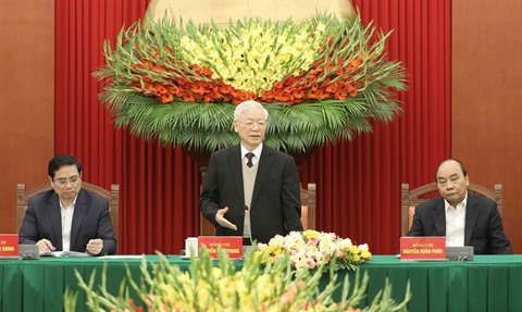 | Le secrétaire général du Parti et président vietnamien, Nguyên Phu Trong (debout), préside la rencontre, le 27 février à Hanoï. |