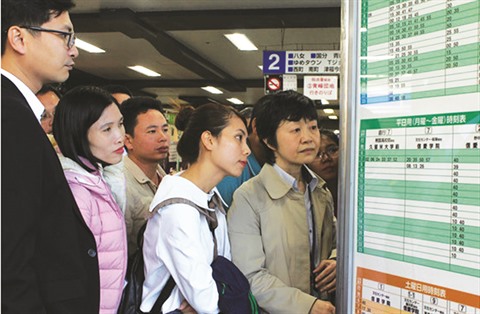 | Izumi Takahashi (1re à droite) durant sa visite d’une gare routière avec de jeunes vietnamiens. |