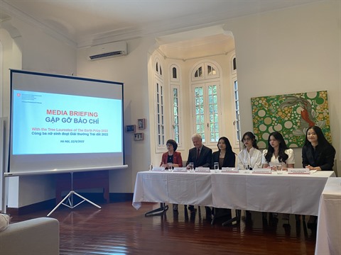 | Lors de la rencontre entre la presse et l'équipe Adorbsies, gagnante du concours +The Earth Prize+, tenue le 22 avril à Hanoï. |