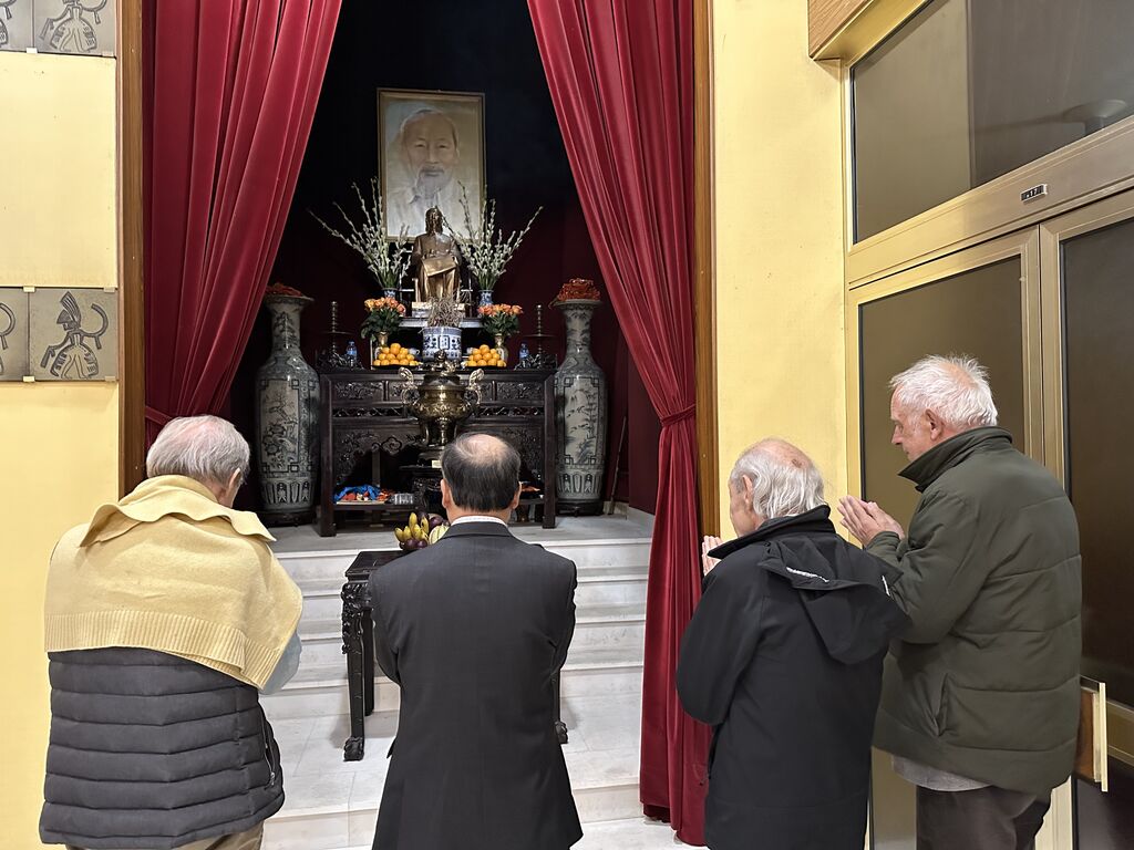| Trois citoyens suisses et l'ambassadeur vietnamien Dinh Toàn Thang brûlent de l'encens devant l'autel de l'Oncle Hô à l'ambassade du Vietnam en France. |