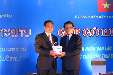 | Lê Hông Son (gauche), vice-président du Comité populaire municipal, et Vilayvong Bouddakham, premier secrétaire du Comité central de l'Union de la jeunesse populaire révolutionnaire du Laos, le 15 décembre à Hanoi. |