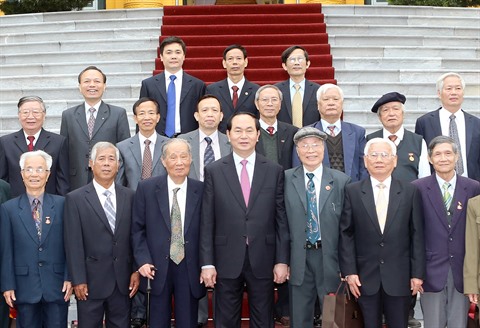 | Le président vietnamien Trân Dai Quang (premier plan, au centre), avec les anciens experts vietnamiens ayant contribué à la révolution cambodgienne. |