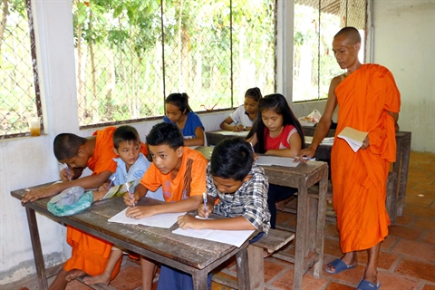 | Un cours d'enseignement de la langue khmère dans une pagode à Vinh Long (Sud). |