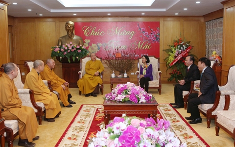 | Truong Thi Mai, présidente de la Commission centrale de sensibilisation auprès des masses du PCV, reçoit le vice-président permanent du Conseil d'administration de l'EBV, le vénérable Thich Thanh Nhiêu, le 19 janvier à Hanoï. |