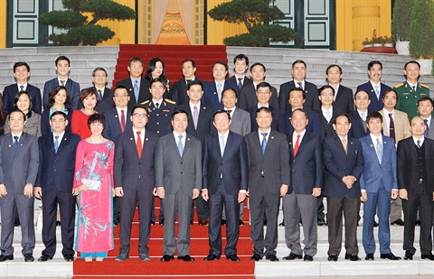| Le président vietnamien Truong Tân Sang (1er plan, 6e, gauche) et les représentants de 63 entreprises lauréates du programme "Label national 2014", le 25 décembre à Hanoi. |