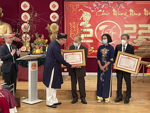 Remise de distinctions aux Viêt kiêu émérites À cette occasion, l'ambassadeur Dinh Toàn Thang a remis des certificats de mérite du Premier ministre à trois personnalités qui sont d'anciens dirigeants de l'UGVF pour leurs réalisations exceptionnelles dans le renforcement et le développement de la communauté vietnamienne en France pour la période 2016-2019.