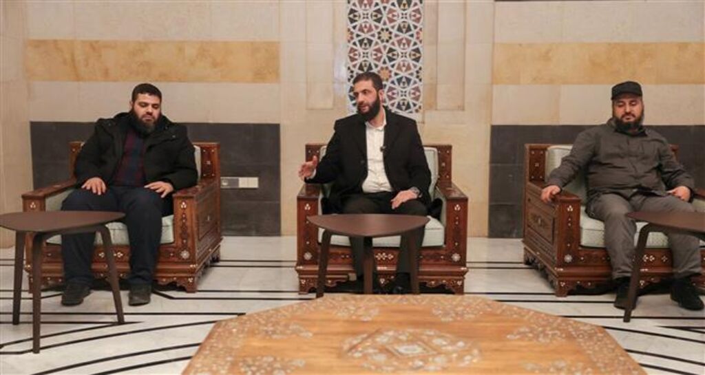 | Le président syrien par intérim Ahmed al-Sharaa (centre) et le ministre syrien de la Défense, Mourhaf Abou Qasra (gauche), à Damas. |