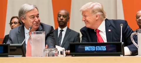 | Le secrétaire général de l'ONU, Antonio Guterres (gauche), et le président américain Donald Trump, lors d'une réunion de haut niveau consacrée à la réforme de l'ONU. |