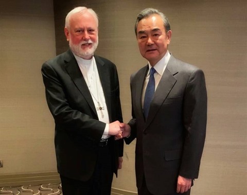 | Mgr Paul Gallagher (gauche),chargé des Affaires étrangères au Vatican et le ministre chinois des Affaires étrangères, Wang Yi, lors d'une rencontre à Munich, en Allemagne. |