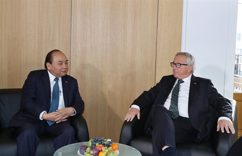Lors de la réunion bilatérale, le Premier ministre Nguyên Xuân Phuc et le président de la Commission européenne, Jean Claude Juncker, ont convenu d'évaluer le développement dynamique des relations entre le Vietnam et l'Union européenne dans de nombreux domaines, politique, économique, commerce, coopération au développement. Le Premier ministre Nguyên Xuân Phuc s'est félicité de l'approbation par la Commission européenne de l'EVFTA, le 17 octobre, de le soumettre au Conseil européen pour approbation, et a suggéré aux deux parties d'exprimer leur détermination à accélérer les procédures pour la signature officielle, concrétisant les énormes avantages que l'EVFTA apporte aux deux parties.