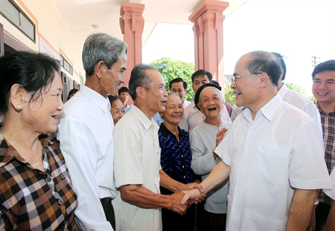 | Nguyên Sinh Hùng (droite) a demandé aux électeurs de Hà Tinh de continuer de présenter leurs avis sur le projet de révision de la Constitution de 1992. |