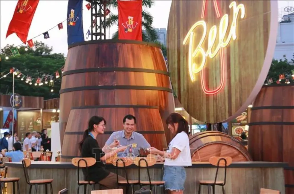 | Des visiteurs dégustent de la bière lors du Festival culturel et gastronomique Vietnam - Belgique 2023. |
