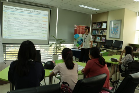 De nombreux étudiants et diplômés se sont rendus à la rencontre qui a duré de 9h à 12h au Campus numérique francophone de l’AUF, antenne de Hô Chi Minh-Ville. Ici, ils ont eu l’ occasion de s’informer des activités et des exigences, des critères d’embauche ainsi que des opportunités de travail dans ce groupe international, à commencer par trois étapes, conférence, pré-sélection, et entretien sur place avec les recruteurs représentant Capgemini.
