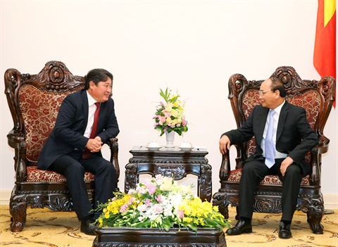 | Le Premier ministre Nguyên Xuân Phuc (droite) et l'ambassadeur de Mongolie, Dorj Enkhbat, le 18 octobre à Hanoï. |