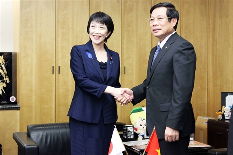 | Le ministre vietnamien de l'Information et des Communications, Nguyên Bac Son, et la ministre japonaise de l'Intérieur et des Télécommunications, Sanae Takaichi. |