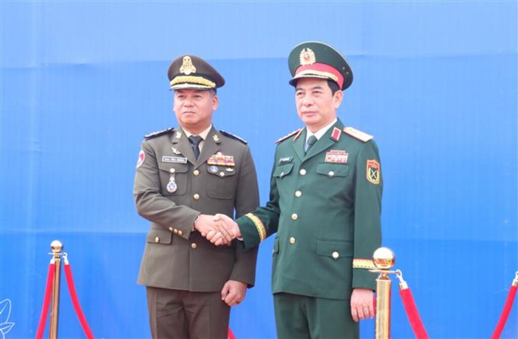 | Le général Phan Van Giang (droite), ministre vietnamien de la Défense et le général Tea Seiha, vice-Premier ministre et ministre de la Défense du Cambodge, le 13 novembre dans la province de Tây Ninh. |