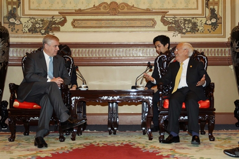 | Le président du Comité populaire de Hô Chi Minh-Ville, Lê Hoàng Quân (droite), et le duc d'York, le prince Andrew. |