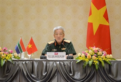 | Le vice-ministre vietnamien de la Défense, Nguyên Chi Vinh, lors de son entretien téléphonique avec son homologue sud-africain Thabang Makwetla, le 9 juillet. |