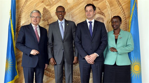 | Didier Reynders (1er gauche) et Alexander De Croo (3e gauche) en visite au Rwanda. |