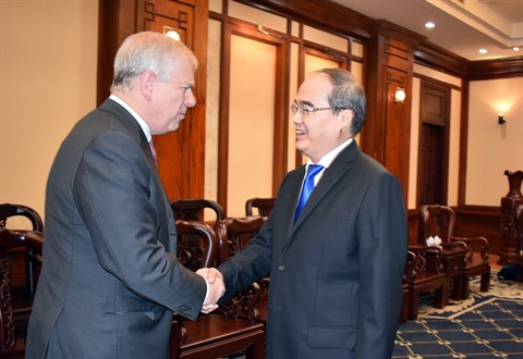 | Le secrétaire du Comité du Parti de Hô Chi Minh-Ville, Nguyên Thiên Nhân (droite), et le prince Andrew Albert Christian Edward, duc d'York, le 3 décembre à Hô Chi Minh-Ville. |