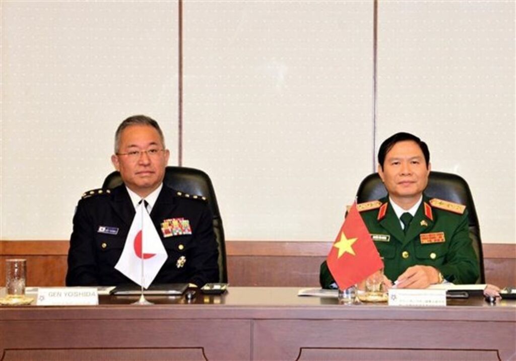 | Entretien entre le général Nguyên Tân Cuong (droite) et le chef d'état-major interarmées des forces d'autodéfense du Japon, Yoshida Yoshihide. |