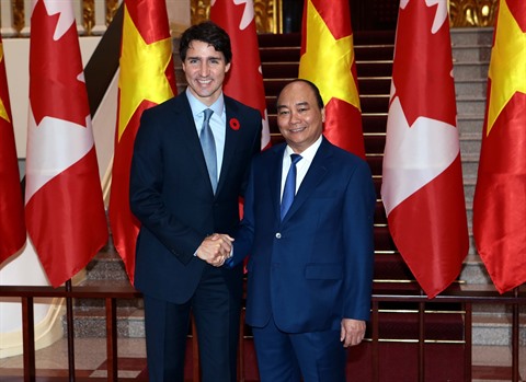 | Le Premier ministre canadien Justin Trudeau (gauche) et le Premier ministre vietnamien Nguyên Xuân Phuc à Hanoï le 8 novembre. |