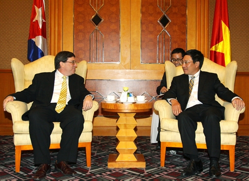 | Le ministre cubain des Affaires étrangères, Bruno Rodriguez Parrilla (gauche), et le vice-Premier ministre et ministre vietnamien des Affaires étrangères Pham Binh Minh, en juillet 2012 à Hanoi. |