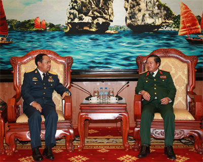 | Le général de corps d'armée Dô Ba Ty (droite), chef d'État major général de l'Armée populaire du Vietnam, vice-ministre de la Défense, et le général Khin Aung Myint, commandant en chef de la Force aérienne du Myanmar, le 30 octobre à Hanoi |