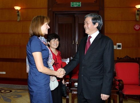 | Dinh Thê Huynh, secrétaire du CC du PCV (droite), et Edelgal Bulmahn, membre de la Commission des affaires étrangères du parlement allemand, le 11 mai à Hanoi. |