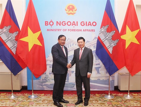 | Le vice-Premier ministre Pham Binh Minh (droite) et son homologue cambodgien Prak Sokhonn. |