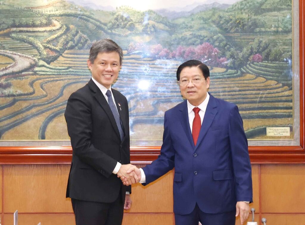 | Le membre du Bureau politique, secrétaire du Comité central et chef de la Commission centrale des affaires intérieures du PCV, Phan Dinh Trac (droire), et Chan Chun Sing, vice-secrétaire général du PAP de Singapour. |