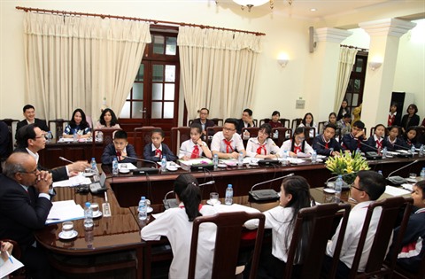 | Le ministre du Travail, des Invalides de guerre et des Affaires sociales, Dào Ngoc Dung (gauche), rencontre, le 20 novembre à Hanoï, 19 enfants représentant des délégués ayant participé au 5e Forum national des enfants 2017. |