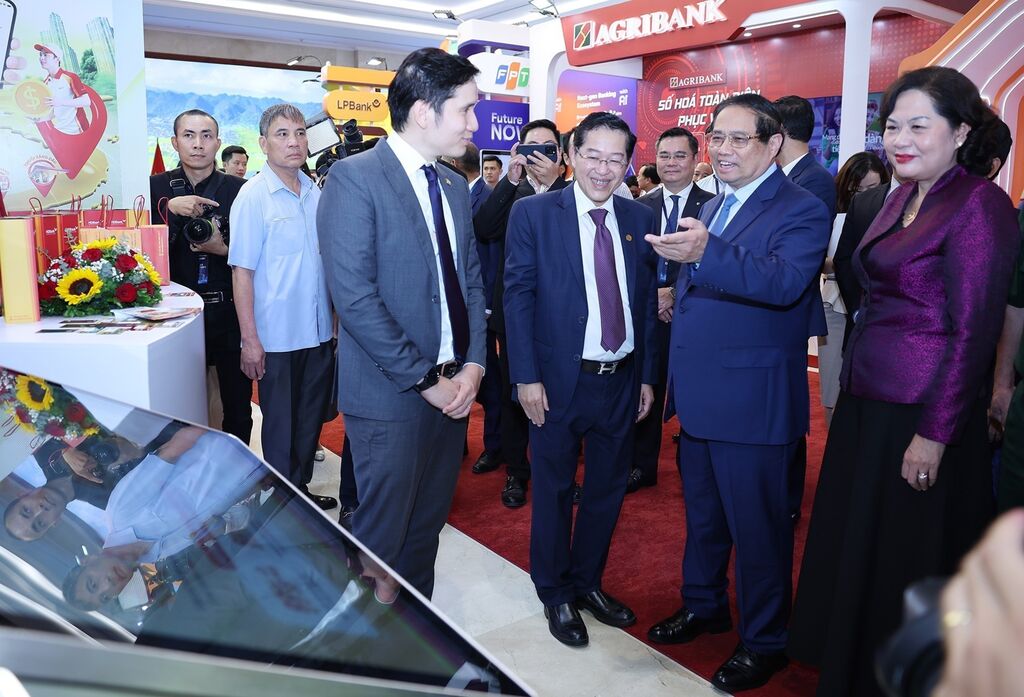| Le Premier ministre Pham Minh Chinh visite l'exposition de produits, services et applications de transformation numérique pour les activités bancaires. |
