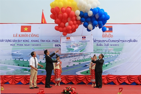| Cérémonie de lancement des travaux de l'aéroport international de Noong Khang, dans la province lao de Houaphan, avec la participation des deux Premiers ministres du Vietnam et du Laos, le 14 mars. |