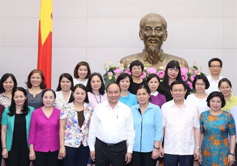 | Le Premier ministre Nguyên Xuân Phuc (centre) et des représentantes des femmes vietnamiennes, le 9 juillet à Hanoi. |