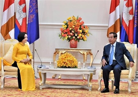| Nguyên Thi Thanh (gauche), présidente de l'Association d'amitié Vietnam -Cambodge rencontre le Premier ministre du Cambodge, Samdech Techo Hun Sen. |