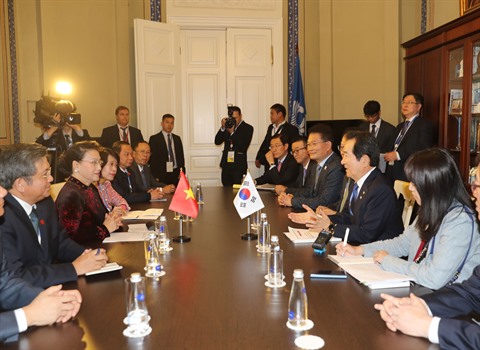 | La présidente de l’AN du Vietnam, Nguyên Thi Kim Ngân (2e à gauche), rencontre le 15 octobre le président de l’AN sud-coréenne, Chung Sye-kyun |