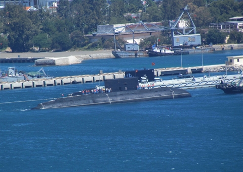 | Le sous-marin Hai Phong, qui fait partie d'un projet de partenariat Vietnam-Russie, au port de Cam Ranh, province de Khanh Hoà (Centre). |