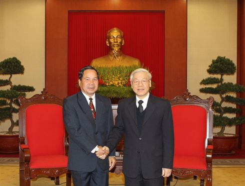 | Le secrétaire général du Parti communiste du Vietnam, Nguyên Phu Trong (droite), et le ministre lao Thongbanh Sengaphone, le 27 décembre à Hanoi. |
