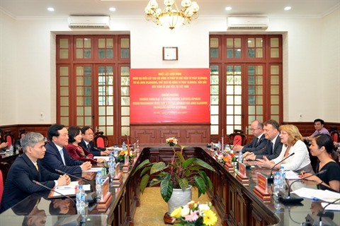 | Entretien entre le président de la Cour populaire suprême du Vietnam, Nguyên Hoà Binh (gauche), et la présidente du Conseil de justice de la République slovaque, Jana Bajankova, le 4 mai à Hanoï. |