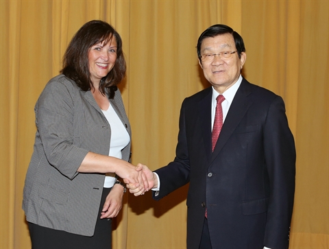 | Le président vietnamien Truong Tân Sang et la présidente du Bureau du ministère des Sciences et des Arts du Land de Hesse, Karin Muller. |