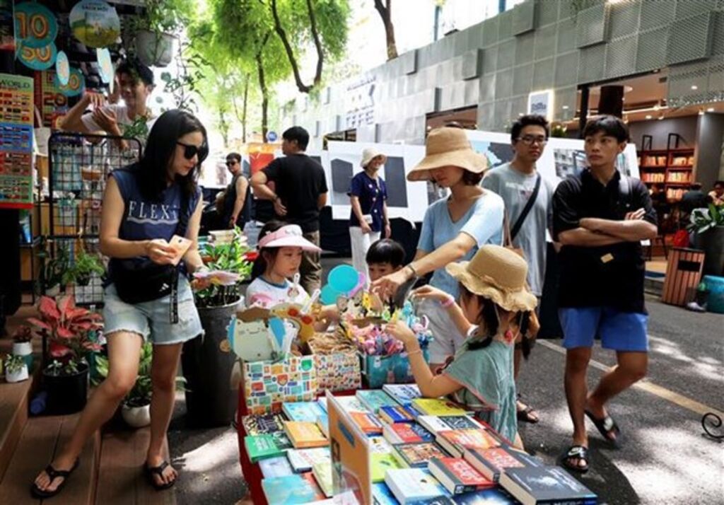 | Des visiteurs internationaux font leurs achats dans la rue des livres à Hô Chi Minh-Ville. |