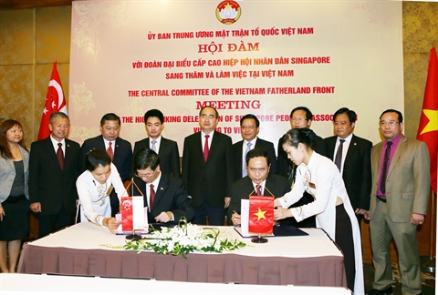 | Cérémonie de signature du protocole d'accord de coopération entre le FPV et l’Association populaire de Singapour, le 20 juin à Hanoi. |