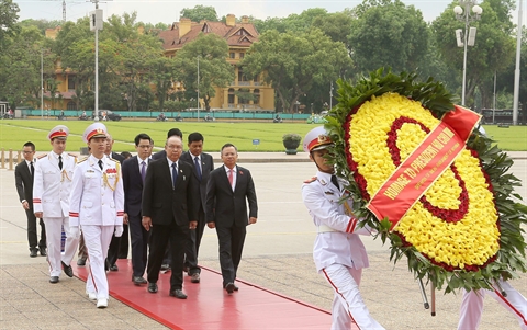 | Le président du Parlement et du Sénat du Myanmar, Mahn Win Khaing Than, à la tête de la délégation birmane, dépose une gerbe de fleurs et rendu hommage au Président Hô Chi Minh en son mausolée. |