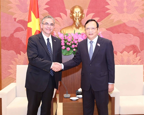 | Le vice-président de l’AN vietnamienne Huynh Ngoc Son (droite) reçoit le président de la Commission argentine des droits de l'Homme, Remo Carlotto. |