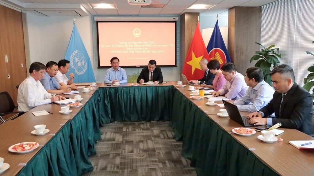 Appréciant les performances de la Mission et des agences représentatives vietnamiennes à New York, Nguyên Van Thê leur a demandé de continuer à mettre en œuvre de manière globale le travail des affaires étrangères, pour orienter vers les congrès du Parti à tous les niveaux et le XIVe Congrès national du Parti.