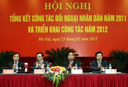 | Réunion pour dresser le bilan des relations extérieurs populaires et en discuter les orientations pour 2012, tenue le 23 février à Hanoi. |