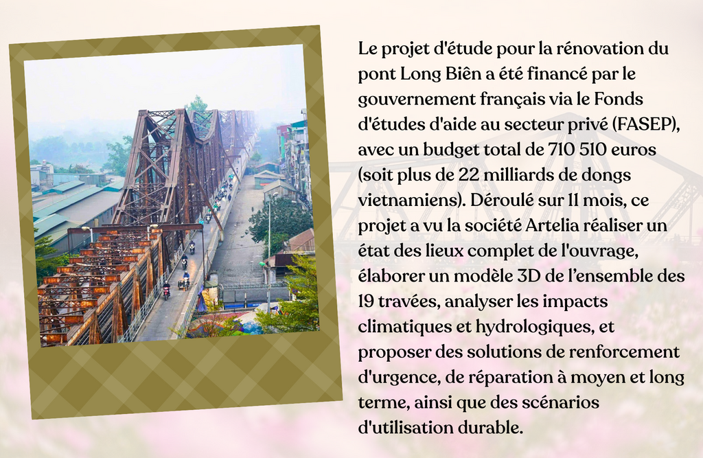 Selon Pierre-Yves Guarini, directeur du projet d’Artelia Vietnam, une étude et des inspections détaillées du pont Long Biên révèlent "la nécessité de prendre des mesures d'urgence". "Ces interventions concernent principalement les piles du pont, ainsi que certaines parties du tablier fortement corrodées qui nécessitent des réparations rapides", a-t-il expliqué.
