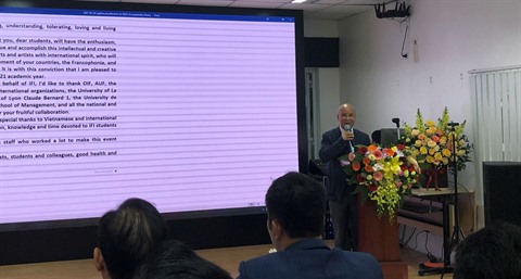 | Ngô Tu Lâp, directeur de l’IFI, prend la parole lors de cérémonie de la rentrée académique 2020-2021, le 26 mars à l’Université nationale de Hanoï. |